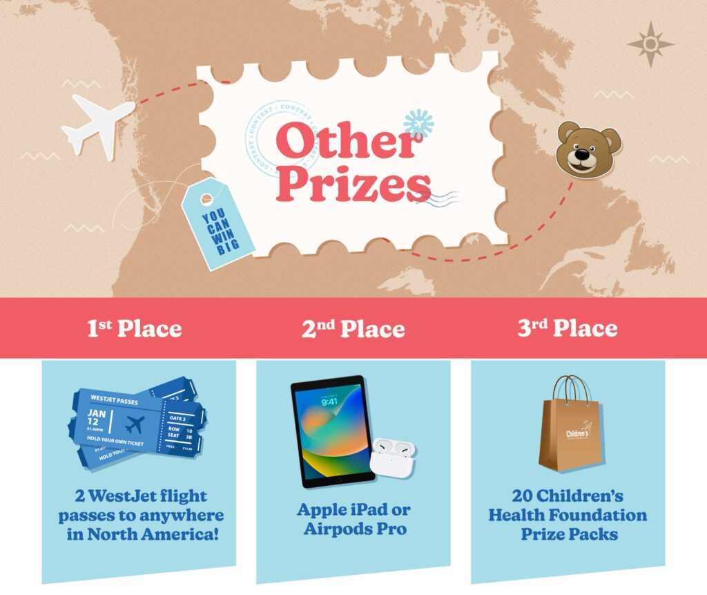 No purchase necessary. Limit of one entry per person. One (1) Grand Prize available to be won. Approximate retail value of Grand Prize CDN$2,900. One (1) Secondary Prizes available to be won. Approximate retail value of Secondary Prize CDN$250-$500. Twenty (20) Tertiary Prizes available to be won. Approximate retail value of Tertiary Prize CDN$30. Must be a resident of Ontario, 18 years of age or older and work at a Children’s Miracle Network corporate partner, Tim Hortons or Liquor Control Board of Ontario store at time of entry. Contest runs from April 1, 2024 to December 31, 2024. Entries must be received by 11:59PM EST on December 31, 2024. Skill testing question must be correctly answered to claim Prize. Odds of being selected depend on number of eligible entries received. For full set of rules click here.