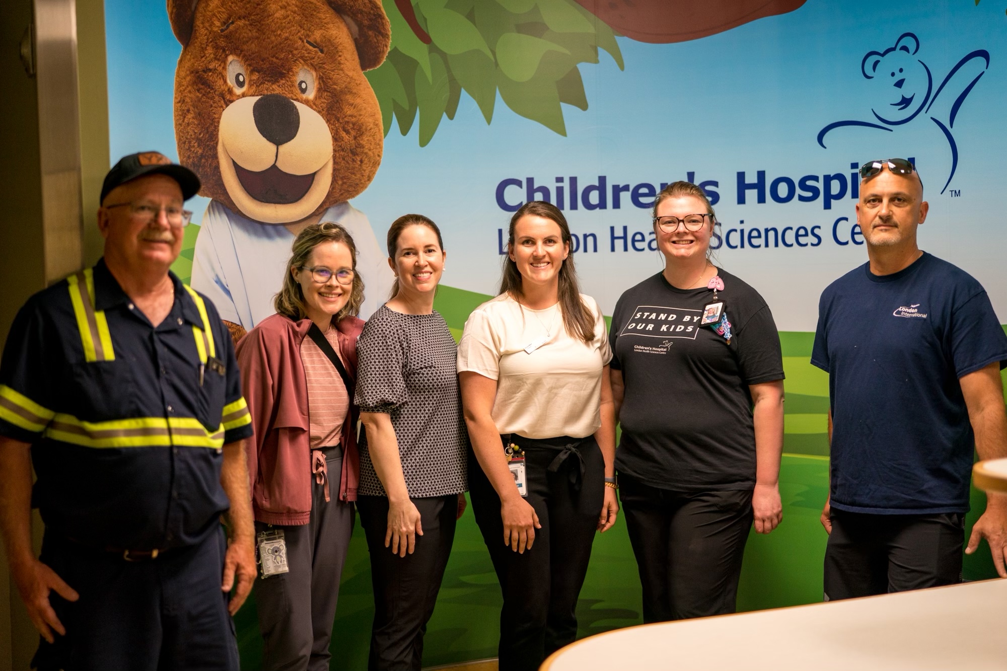 Six people posing in front of a Children's Hospital mural.