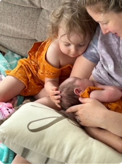 “Now with our second daughter, although breastfeeding feels so welcomed and safe and like a familiar comfort, there are new dynamics to learn between me and our latest little love,” she explains. “There is pain, anxiety, stress, peace, comfort and tons of love-filled gratitude and tears of both challenge and joy! Having our midwives (Meg) at home with us, and Beth right after she was born in the delivery room, has provided us with so much validation, peace of mind, guidance and encouragement.”